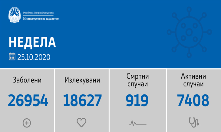 Македонија Новозаболени 865, починати 10 и оздравени 359 пациенти од Ковид -19 во државата 1 ноември, 2020