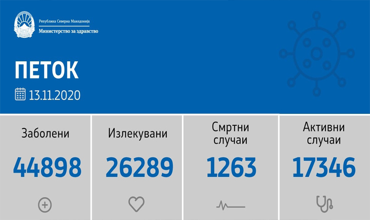 Велес Во Велес нови 44 заболени, починат пациент во болница од Свети Николе и оздравени 39 граѓани 13 ноември, 2020