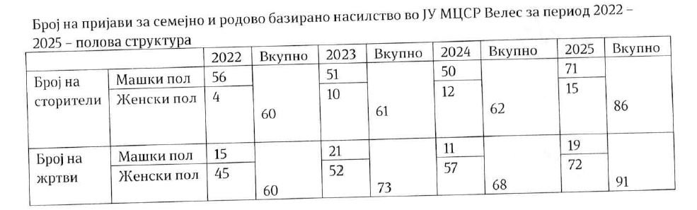 Според податоците што ги добивме од СВР Велес, во текот на 2025 година од пријавените кривични дела во областа на семејно насилство, како жртви се јавуваат 31 жртва од женски пол и 24 жртви од машки пол, а од наведените, 12 женски лица се деца и 13 машки лица се деца. Според националноста на жртвите, 74 лица се Македонци, 23 лица се Роми, 8 лица се Бошњаци, а Албанци се две лица. Поднесени се два предлога за мерки до Основен суд и изречени се 37 мерки за заштита по предлог на Центарот за социјални работи. Во Центарот за привремен престој на жртви од семејно насилство во текот на 2024 година биле сместени две лица, а во текот на 2025 година едно лице.