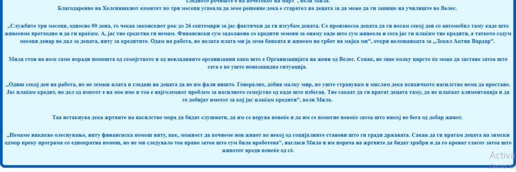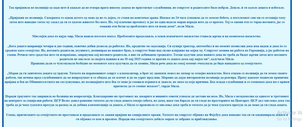 „Дел од жртвите се соочуваат со предрасуди поради нивната зависност од партнерот или поради недоволно разбирање на нивната реална состојба. Потребен е внимателен и професионален пристап, со емпатија, трпение и разбирање, со цел жртвите да добијат соодветна поддршка и заштита. Во сегашниот систем постојат ограничувања во однос на просторните и кадровските капацитети за работа со жртви, особено во делот на психолошката поддршка. Процесите во полиција бараат тимска и стручна соработка, при што улогата на психолозите е од клучно значење, особено при работа со деца и со чувствителни категории. Важно е исказите да се проценуваат внимателно, без предвремени заклучоци, со цел да се утврди вистинската состојба. Секако, постојат и поединечни случаи каде што системот бил злоупотребен, но тие не смеат да бидат причина за недоверба кон вистинските жртви. Потребен е индивидуален пристап кон секој случај, при што не може сите жртви да се проценуваат според ист шаблон“, вели психологот Ангелина Димовска Стојанова, која работи во Сервисот за психолошка и социјална поддршка на жени во Велес.