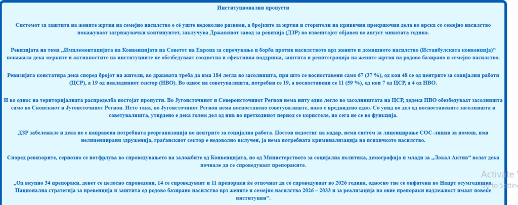 Анализата на мерките што се преземаат во случаите со семејното насилство покажува дека иако институциите формално постапуваат, изрекуваат мерки и бележат зголемена свест кај жртвите, бројките покажуваат дека насилството не се намалува, туку добива нови размери. Недостигот од стручен кадар, советувалишта, психолошка поддршка и долгорочни решенија за домување и економско осамостојување, создаваат ризик жртвите повторно да се вратат во средина во која се небезбедни.