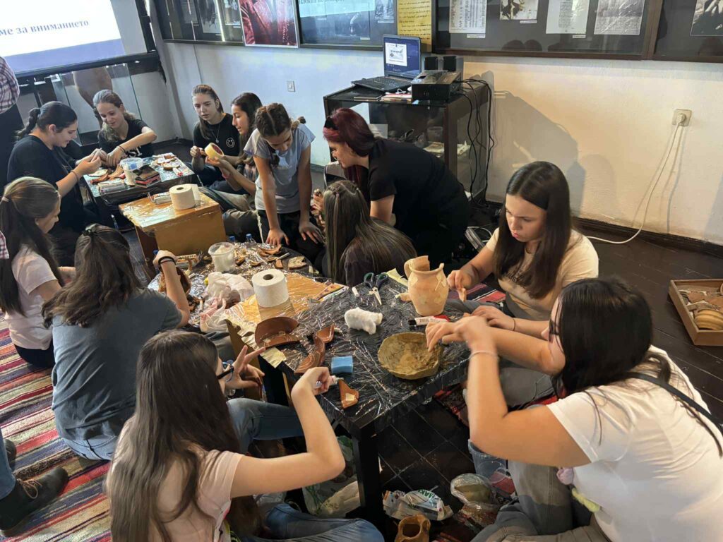 Во вториот дел од работилницата, ученичките имаа задача да составуваат скршени керамички предмети – слично како што археолозите реконструираат артефакти од бројни фрагменти. Дополнително, тие самите моделираа предмети со глина и глинамол, користејќи инспирација од музејски експонати.