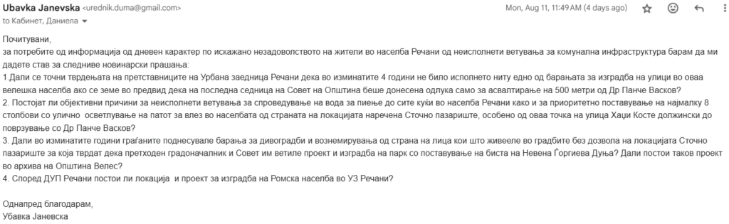Дума.мк до Општина Велес, пред четири дена, испрати новинарски прашања во кои побара одговор или став за реакцијата на жителите на велешката населба „Речани“. До објавувањето на текстот општината не одговори на прашањата. Доколку стигнат одговори Дума.мк ќе ги објави.