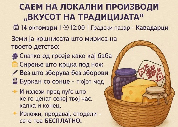 -Вкусот на локалните производи ја раскажува приказната на еден народ. На раце што создаваат, на срце што не заборава. Ќе имаме кошници полни задоволства што мирисаат на едно детство, изјави Марија Камчева, координатор за еднакви можности при Општина Кавадарци. Таа ги повика граѓаните да го поддржат трудот на локалните производители и да ја негуваат традицијата.