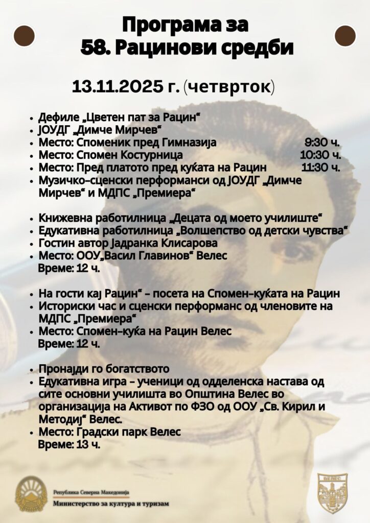 Утре, 14 ноември, градот ќе заживее во боите на детството. Најмалите велешани од градинката „Димче Мирчев“ ќе го започнат денот со дефилето „Цветен пат за Рацин“, кое ќе се движи кај споменикот кај Гимназијата, на Спомен-Костурницата и пред куќата на Рацин каде ќе се одржи и музички перформанс со МДПС „Премиера“.