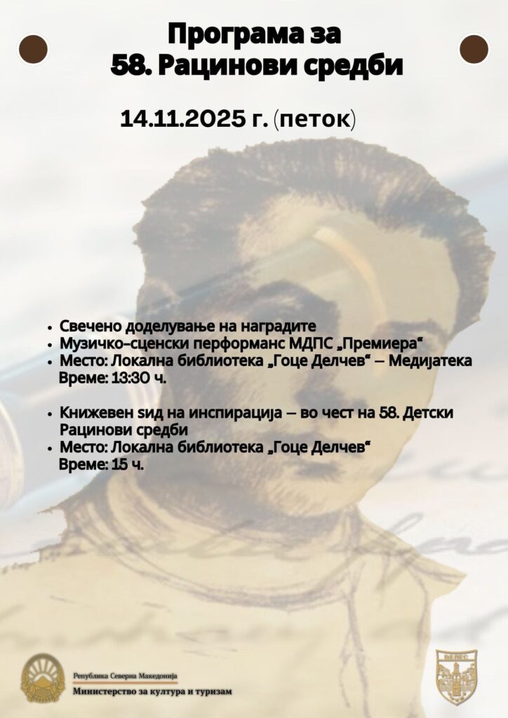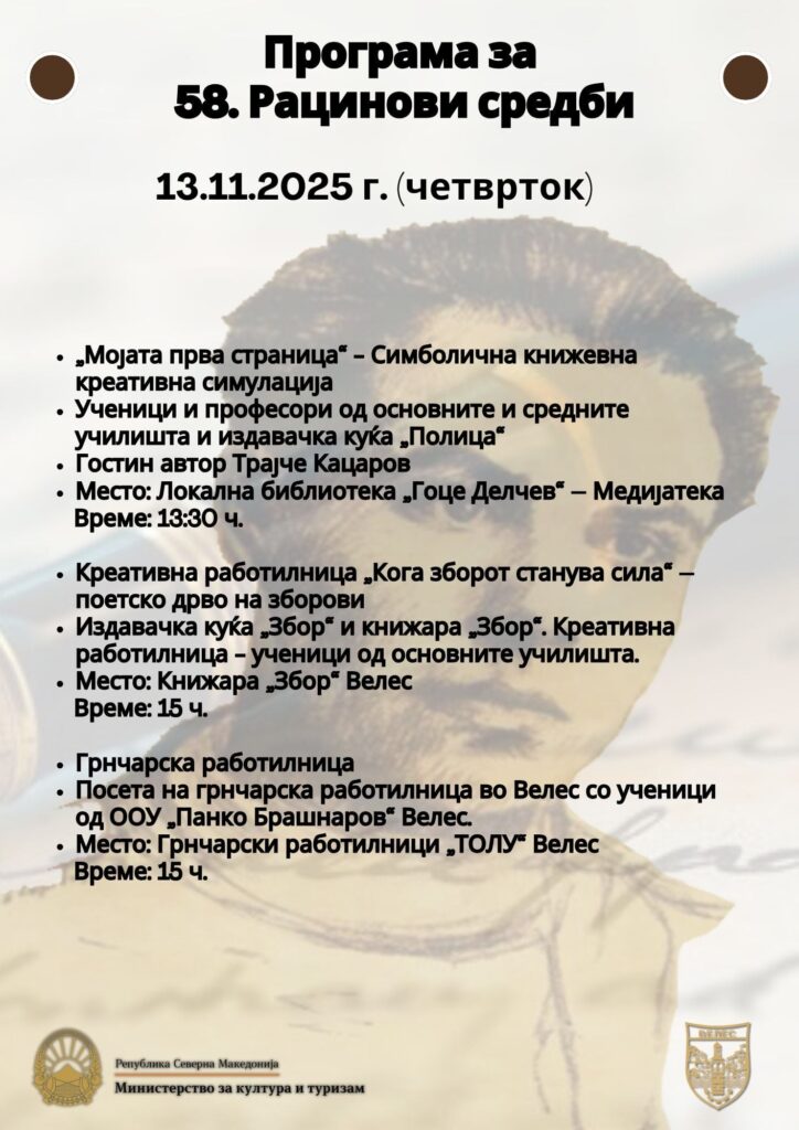 Во градот каде што зборот првпат прозборел со сила, а песната станала борба и светлина, повторно оживува духот на големиот Коста Солев Рацин. Велес, неговиот роден град, уште еднаш се претвора во сцена на детската имагинација, инспирација и љубов кон уметноста. Детските Рацинови средби, кои годинава го бележат своето 58. издание, започнaa денес и претставуваат синоним за креативност, поезија, едукативност и детска радост – вистински празник на зборот и културата.