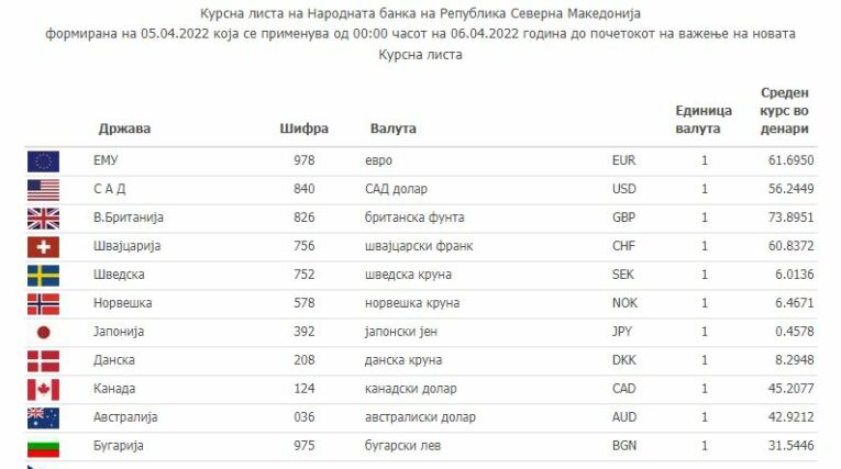 Според средната курсна листа на НБРСМ, еврото денеска изнесува 61.6950 денари, а американскиот долар чини 56.2449 денари. Британската фунта изнесува 73.8951 денари.
