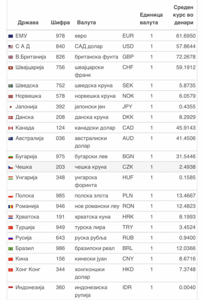Според средната курсна листа на НБРСМ еврото денеска изнесува 61.6950 денари, а американскиот долар чини 57.8644 денари. Британската фунта изнесува 72.2678 денари.