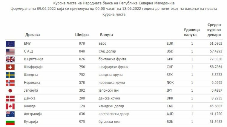 Според средната курсна листа на НБРСМ, еврото денеска изнесува 61.6963 денари, а американскиот долар чини 57.4293 денари. Британската фунта изнесува 72.0330 денари.