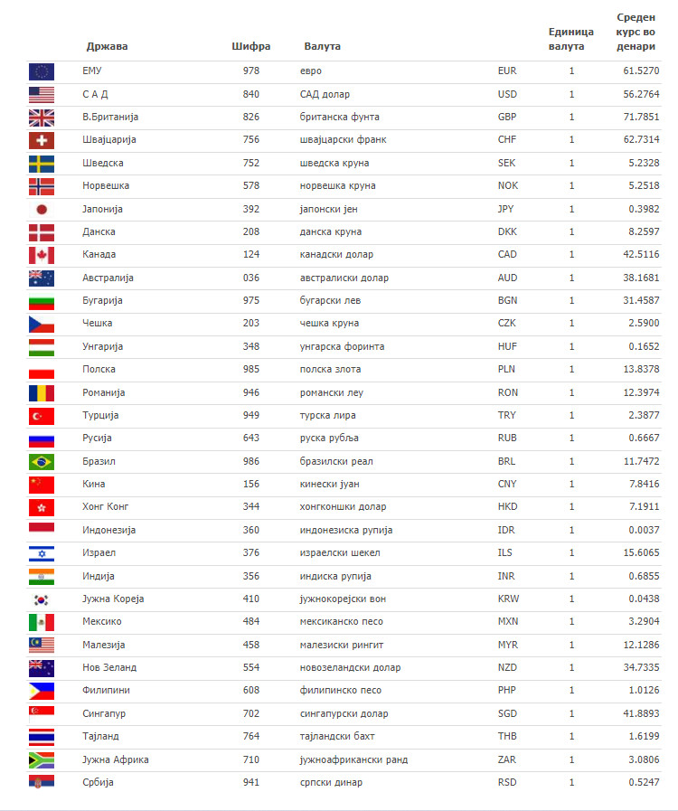 Според курсната листа на НБРСМ средниот курс на еврото денеска изнесува 61.5270 денар, а на американскиот долар 56.2764 денари. Средниот курс на британската фунта изнесува 71.7851 денари.