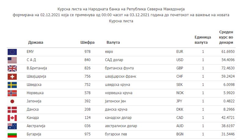 Според средната курсна листа на НБРСМ, еврото денеска изнесува 61.6950 денари, а американскиот долар чини 54.4096 денари. Британската фунта изнесува 72.4630 денари.