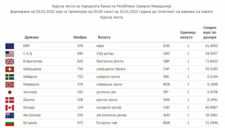 Според средната курсна листа на НБРСМ, еврото денеска изнесува 61.6950 денари, а американскиот долар чини 54.5057 денари. Британската фунта изнесува 73.8420 денари.