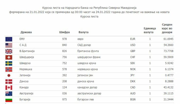 Според средната курсна листа на НБРСМ, еврото денеска изнесува 61.6945 денари, а американскиот долар чини 54.3660 денари. Британската фунта изнесува 73.7708 денари.