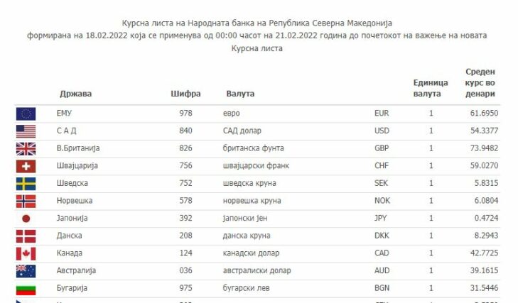 Според средната курсна листа на НБРСМ, еврото денеска изнесува 61.6950 денари, а американскиот долар чини 54.3377 денари. Британската фунта изнесува 73.9482 денари.