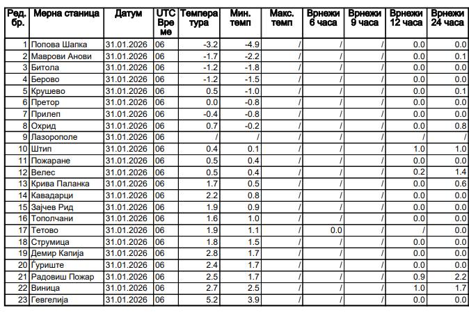 На табелата објавена од страна на УХМР може да видиме дека најладно утрово до 7 часот беше на Попова Шапка со измерени -5 степени а највисока минимална температура од 4 степени во исто време беше измерена во Гевгелија,“ соопшти метео прогнозерот Славчо Попоски.