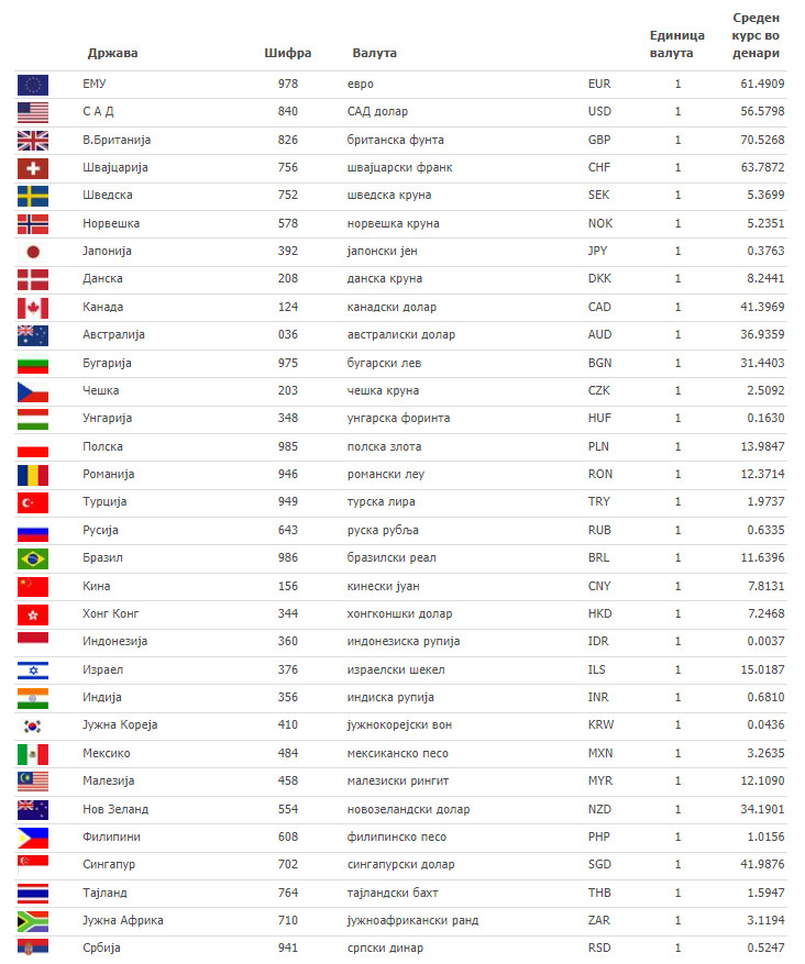 НБРСМ: Курсна листа за 16 ноемвриОбјавено: 16 ноември, 2023, во 08:06 часот Според курсната листа на НБРСМ средниот курс на еврото денеска изнесува 61.4909 денари, а на американскиот долар 56.5798 денари. Средниот курс на британската фунта изнесува 70.5268 денари. Дума.мк Сподели: