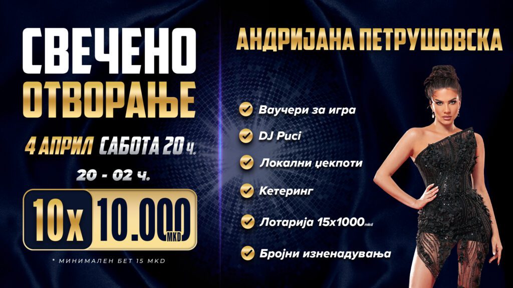 Бидете дел од свеченото отворање на клубот во Велес, на 4 април (сабота) со почеток од 20 часот. Ве очекуваат многу ваучери за игра, лотарија, бројни изненадувања и локални џекпот добивки од 10.000 денари!